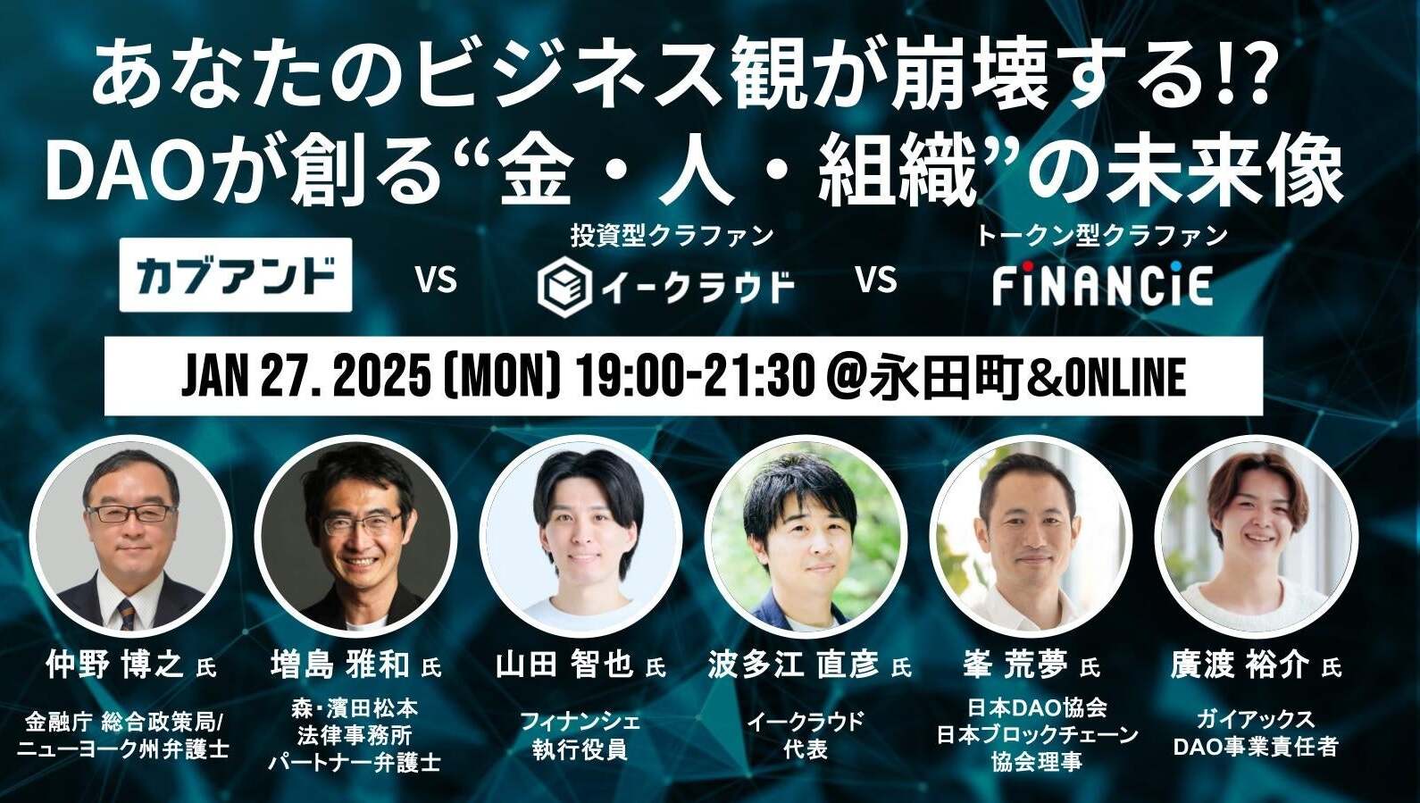 2025年1月27日(月)、東京・永田町のMIDORI.so NAGATACHOにて、ガイアックス主催のDAOセミナー「DAOの社会実装を事例で深堀り〜カブアンド、投資型クラファン、トークン型クラファン〜」が開催されました。投資型クラウドファンディング(CF)やトークン型CFなど、DAOと親和性の高い新しい資金調達スキームをテーマに据えたイベントです。