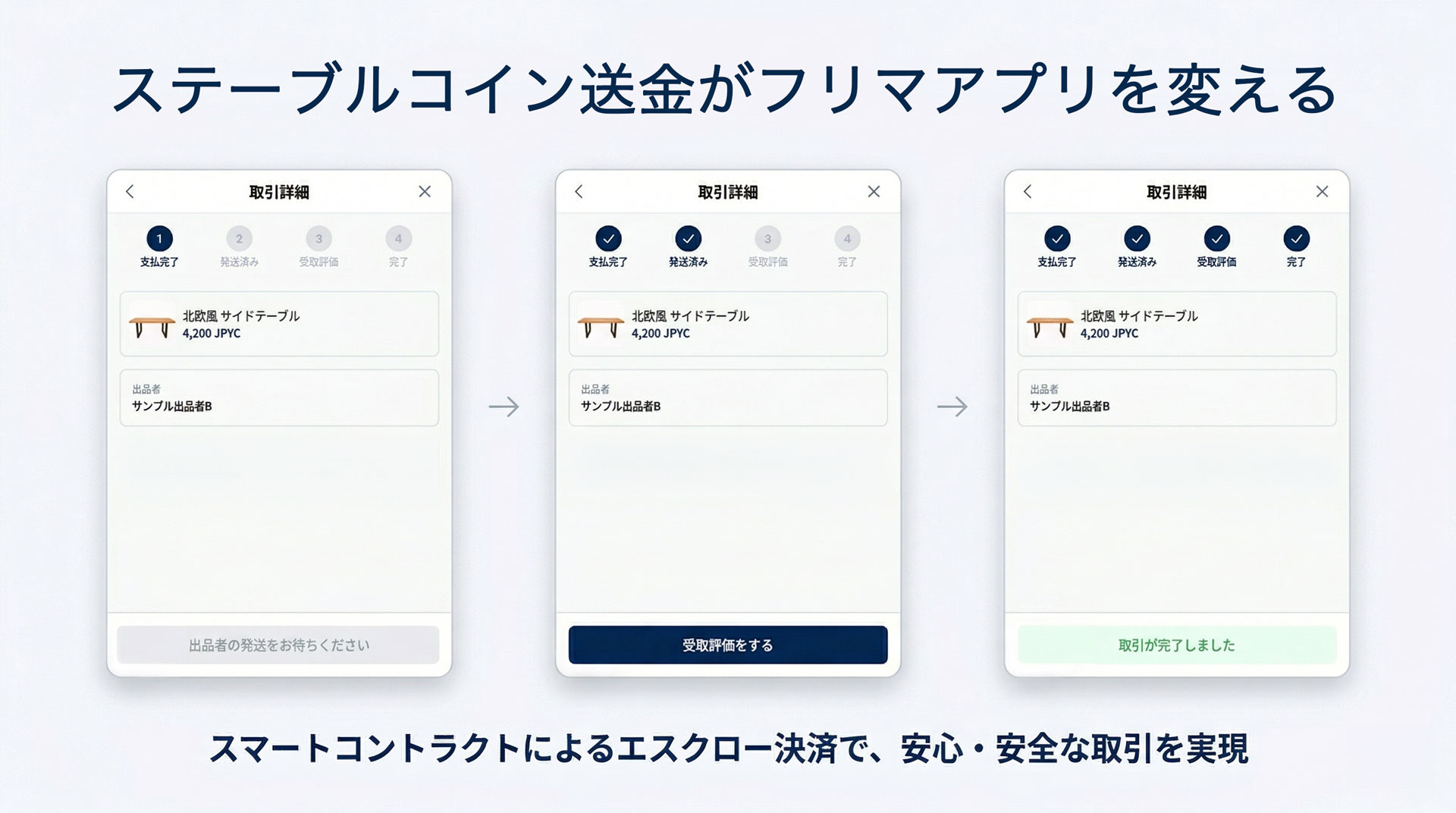 スマートコントラクトによる自律型エスクローで、代金預かりリスクを排除したC2Cマーケットプレイスを構築。日本円連動ステーブルコイン「JPYC」で、安心・安全な個人間取引を実現します。